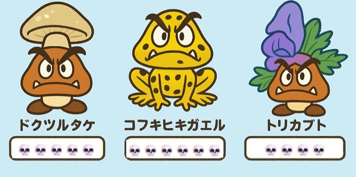 名前 | どんな生物? | 毒のはたらき | 毒の強さ (6段階) | マリオは? |