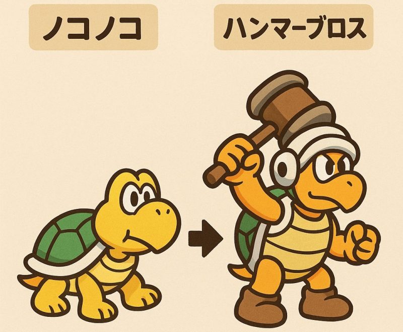スーパーマリオに登場するカメの敵キャラ「ノコノコ」と「ハンマーブロス」